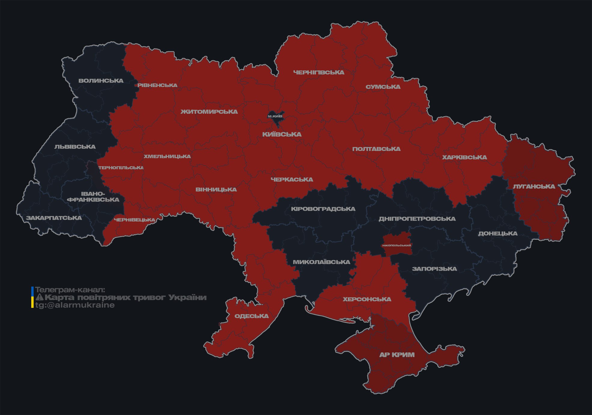 Станом на 3:41 карта повітряних тривог України виглядає так: