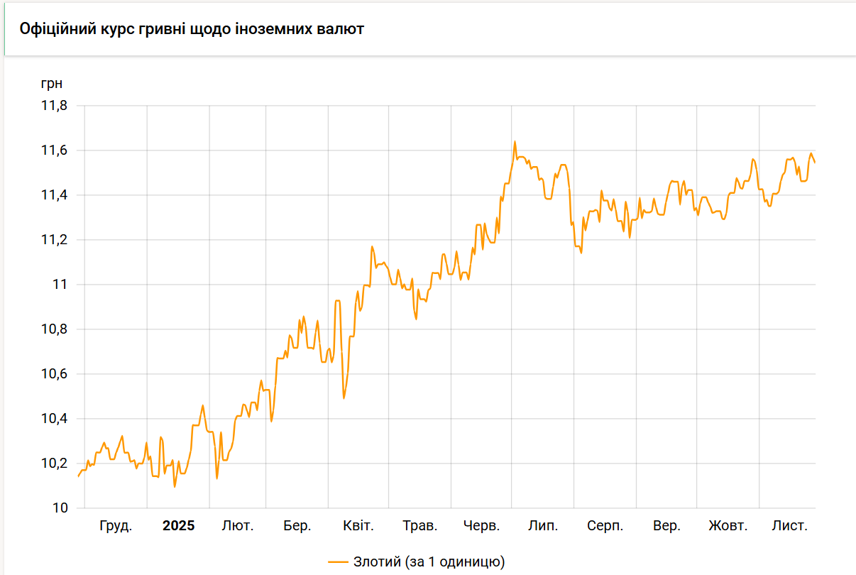 З початку листопада злотий додав 12 копійок: 1 листопада його курс становив 11,42 гривні. Порівняно з 1 січня 2025 року польська валюта подорожчала на 1,29 гривні. На початку року її вартість була на рівні 10,21 гривні.