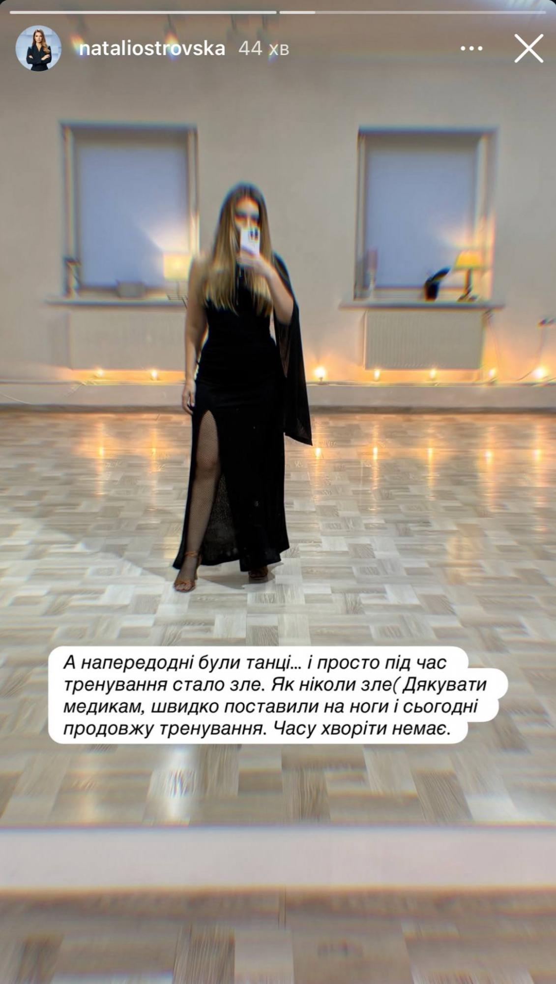 "А напередодні були танці… і просто під час тренування стало зле. Як ніколи зле. Дякувати медикам, швидко поставили на ноги і сьогодні продовжую тренування. Часу хворіти немає", - написала журналістка.