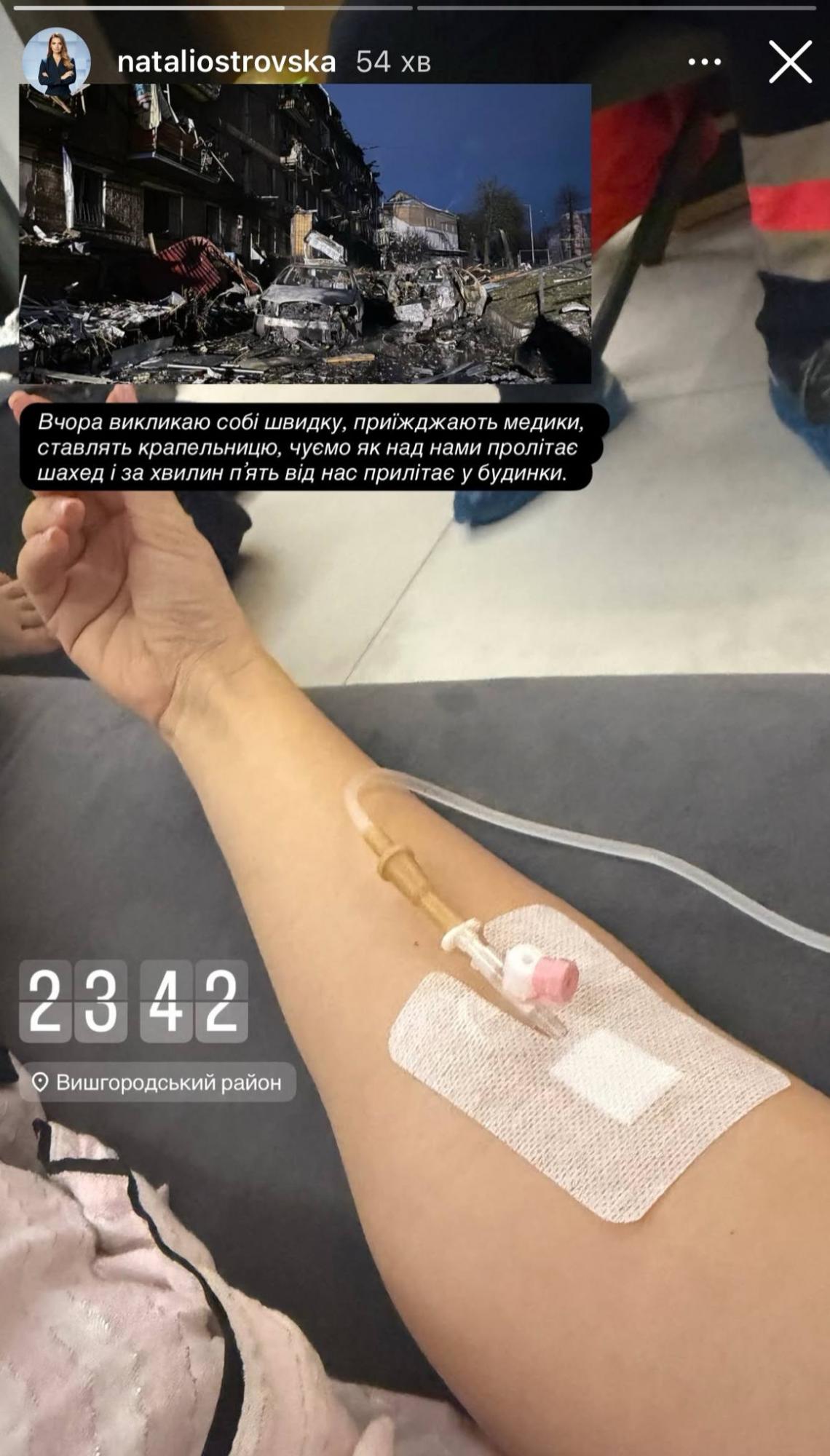 Так, у своїх сторіс телеведуча показала фото руки з підключеною крапельницею та кадри з наслідками обстрілу.